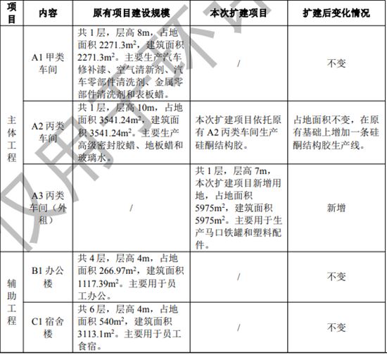 项目内容:本次扩建项目主要租赁原项目南侧广州文星实业有限公司厂区内 D 区、E 区、F 区、G 区厂房(位于广州市增城区中新镇恒创工业园 3 号,下文称“A3 丙类车间 ”)作为新增产品马口铁罐和塑料配件生产线,新增产品硅酮结构胶生产线则依托原项目 A2 丙类车间进行生产。扩建前项目占地面积 26679.9m2,建筑面积 15909.91m2,扩建项目新增占地面积 5975m2,新增建筑面积 5975m2,主要建筑为一个 1 层生产车间,内设注塑区、制罐区和仓库。本次扩建项目主要增加马口铁罐、塑料配件和硅酮结构胶生产线,新增三种产品(马口铁罐、塑料配件和硅酮结构胶),不改变原有项目的产品种类和产能、员工人数以及工作班制。扩建后项目总占地面积 32654.9m2,总建筑面积 21884.91m2。