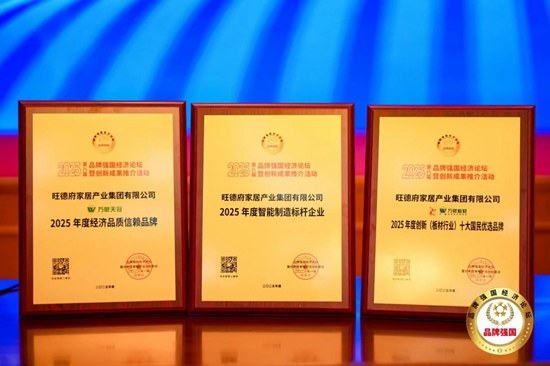 凭借在家居建材行业的持续深耕与突破性创新实践,旺德府家居集团及旗下核心品牌万象板材、万象天冠高端实木全屋定制,从众多参选企业中脱颖而出,一举摘得品牌强国“2025年度智能制造标杆企业”、“2025年度创新(板材行业)十大国民优选品牌”、“2025年度经济品质信赖品牌”三项重磅荣誉,为集团高质量发展的品牌进阶之路再添浓墨重彩的一笔。