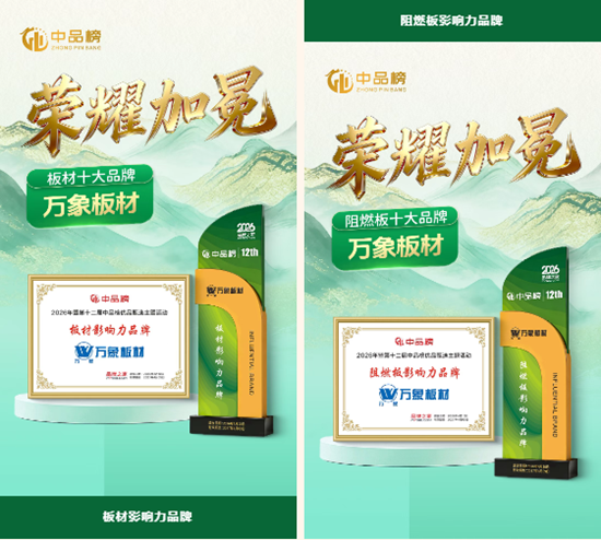 旺德府集团旗下核心品牌——万象板材,凭借二十七载深厚的品牌积淀、硬核的产品品质以及行业领先的研发实力,在众多参评品牌中脱颖而出、强势突围,再次蝉联桂冠,斩获“板材影响力品牌”、“阻燃板影响力品牌”两项重磅大奖,以实打实的硬实力,诠释了万象品牌的标杆风范与责任担当。