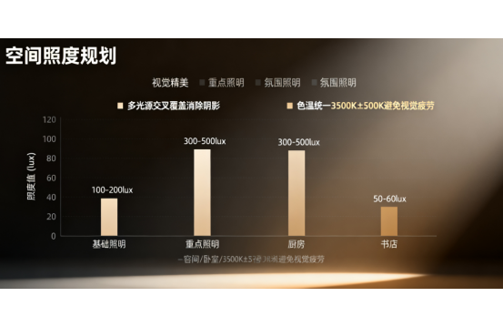 色温的合理搭配能有效降低视觉疲劳,客厅建议采用3500K4000K中性光,卧室选择3000K以下暖光。同一空间内色温偏差不宜超过500K,避免冷色光与暖色光直接混搭产生的视觉冲突。