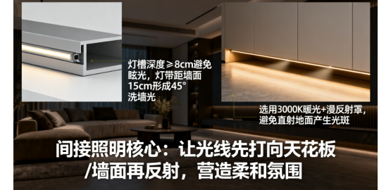关键词:LED灯带间接照明高级感设计、洗墙效果光束角安装距离、Ra95高显色灯带场景适配、无主灯双层次洗墙施工、防频闪防水灯带卫生间应用