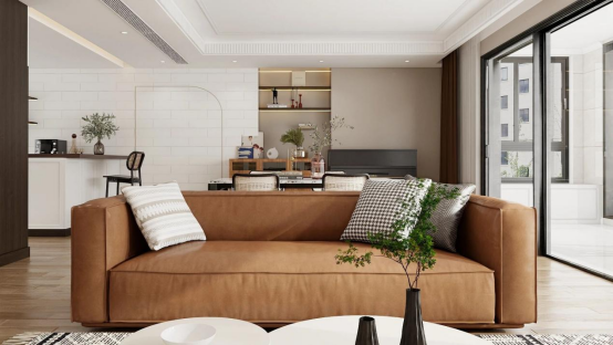 暖棕皮质沙发如温润璞玉,成为空间核心,纹理抱枕晕染出柔和质感。背景墙一侧,开放式置物架既是摆件与书籍的展示舞台,也悄然收纳生活琐碎;餐厨区定制木质柜体,裹挟着玻璃元素,为餐具、食材筑起一方有序天地。