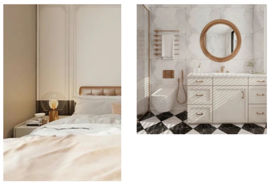 卧室定制柜体与整体风格无缝相融,以利落线条自然承接入户动线,将衣物、日常杂物妥帖收纳;主卧卫生间用白色大理石通铺墙面,勾勒出温润质感基底,定制收纳空间为洗漱用品量身规划,更巧妙嵌入实用设施,让洗衣、梳妆、洗浴功能在此立体交织。