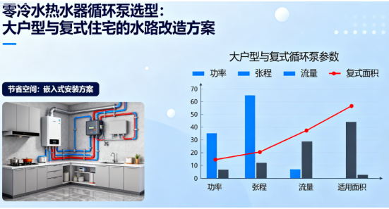 循环泵作为零冷水系统的"心脏",其选型绝非简单根据房屋面积选择功率即可。在大户型与复式住宅中,水路长度、管道材质、用水点分布等因素都会影响循环泵的工作效率,需重点关注以下三个核心参数: