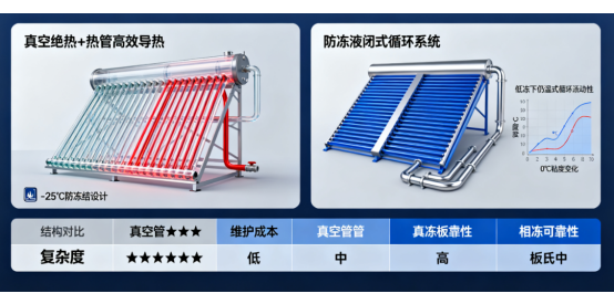在北方地区的冬季,太阳能热水器的防冻问题一直是用户关注的焦点。作为清洁能源利用的重要设备,太阳能热水器在低温环境下的运行稳定性直接影响其使用体验和寿命。目前市场上主流的防冻技术主要分为真空管热管式和平板式两大类,二者在技术原理、适用场景和实际效果上存在显著差异。本文将从结构特性、防冻机制、性能表现和维护成本四个维度,深入解析两种技术方案的核心差异,为消费者选择适合的太阳能热水器提供专业参考。