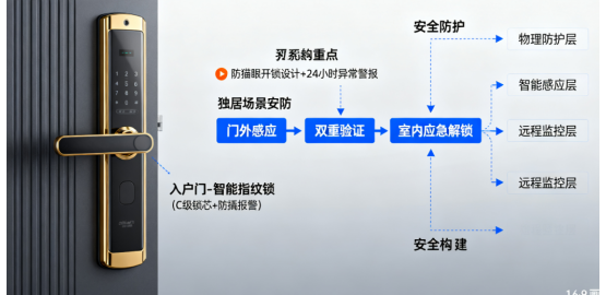 入户门作为家庭安全的核心防线,建议构建"三重防护体系":外层配备人脸识别门禁,中层安装带虚位密码功能的智能锁,内层设置机械防盗链。这种组合能有效应对技术性开锁与暴力破门等多种风险。对于有老人和小孩的家庭,可在智能锁中增设胁迫指纹功能,通过预设指纹触发无声报警。