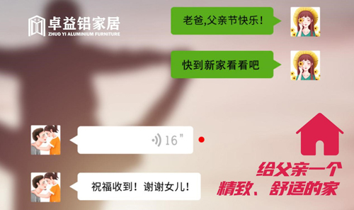 卓益铝家居提供铝家居整体定制方案、一站式购齐配套和整合供应体系,全方位打造符合现代生活环保健康需求的产品,缔造低碳健康生活,开启节能美好新时代。趁着父亲节,为父亲定制一套卓益铝家居,让家真正成为避风的港湾、温馨的摇篮、健康安全的人间天堂。