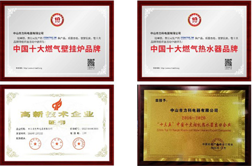 力科荣获中国品牌网“十大燃气壁挂炉”和“十大燃气热水器”称号,获得“高新技术企业”和“中国十大烟机热水器出口企业”荣誉,产品荣登央视舞台,与央视CCTV合作。