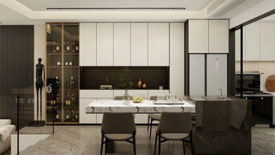 沙发背后与餐厨区定制餐边柜采用一体化设计逻辑,通过玻璃、金属框与同色系板材的材质呼应,以及线条的无缝延续,消弭了客厅与餐厨空间的物理割裂感。